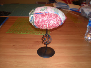 For this giveaway, I have made a homemade pincushion on a pedestal of sorts. The stand is a thrift store find, well suited for this purpose. There are two pictures below of the same pincushion from different vantage points. Leave your comment on this post to be entered into my drawing. Please only post once, and do so by February 15th. A winner will be selected using the random number generator.